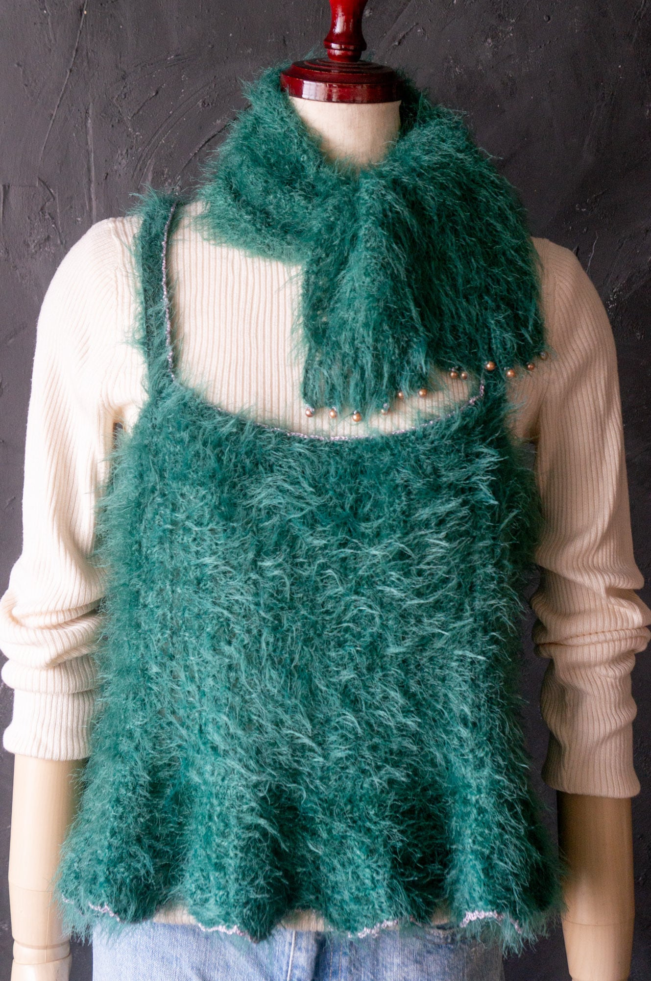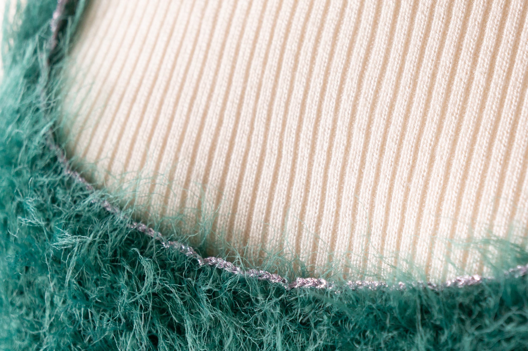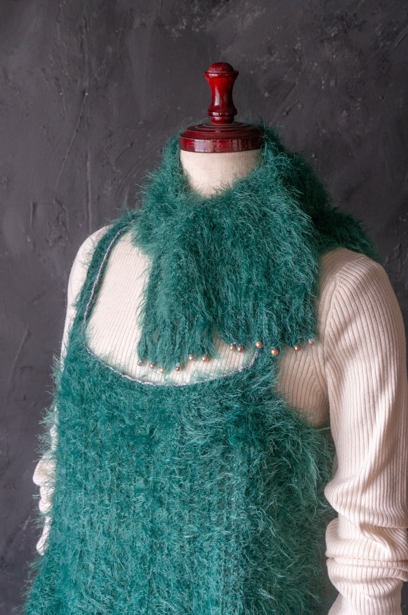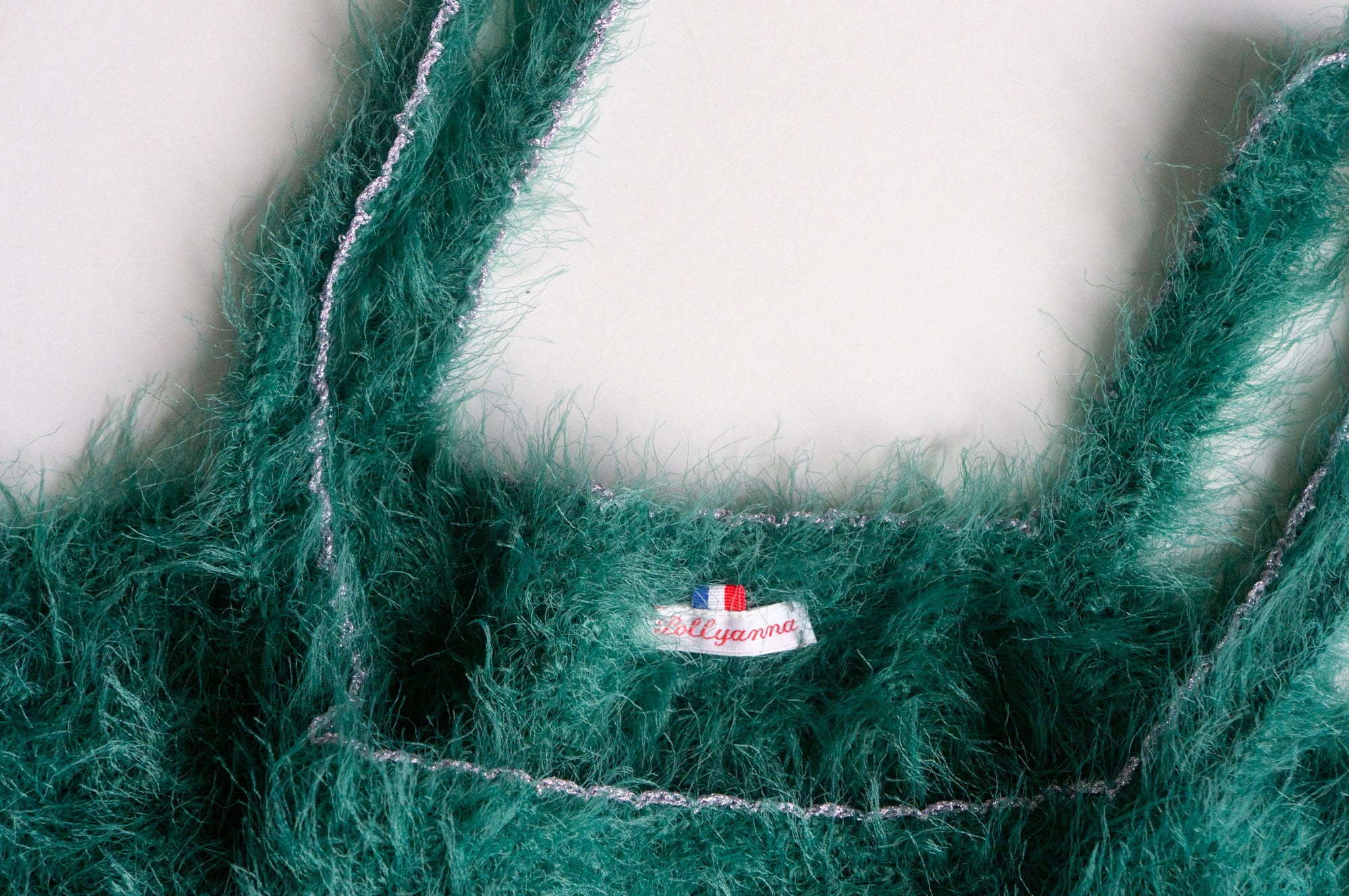深みのあるグリーンの糸に、襟ぐりと裾を縁取るようにシルバーラメ糸の飾り編みが施されています。