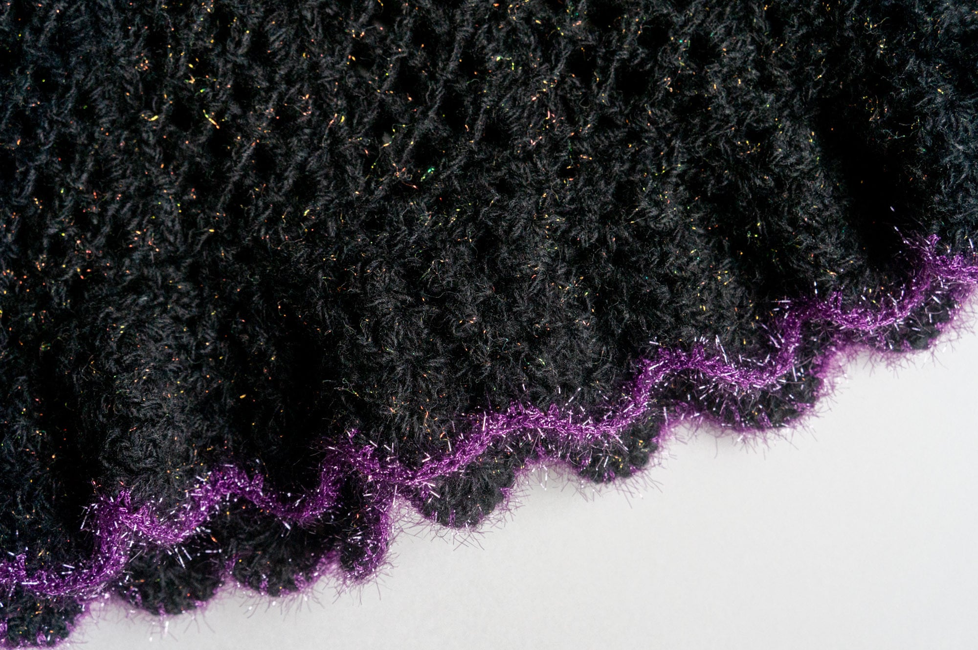 襟ぐりと裾にはパープルのラメ糸で縁飾りが施され、個性と華やかさを添えています。