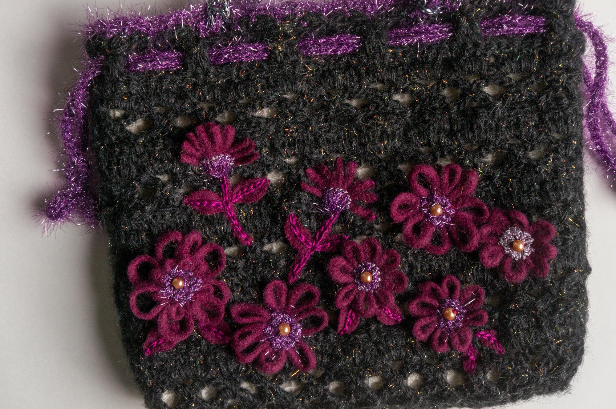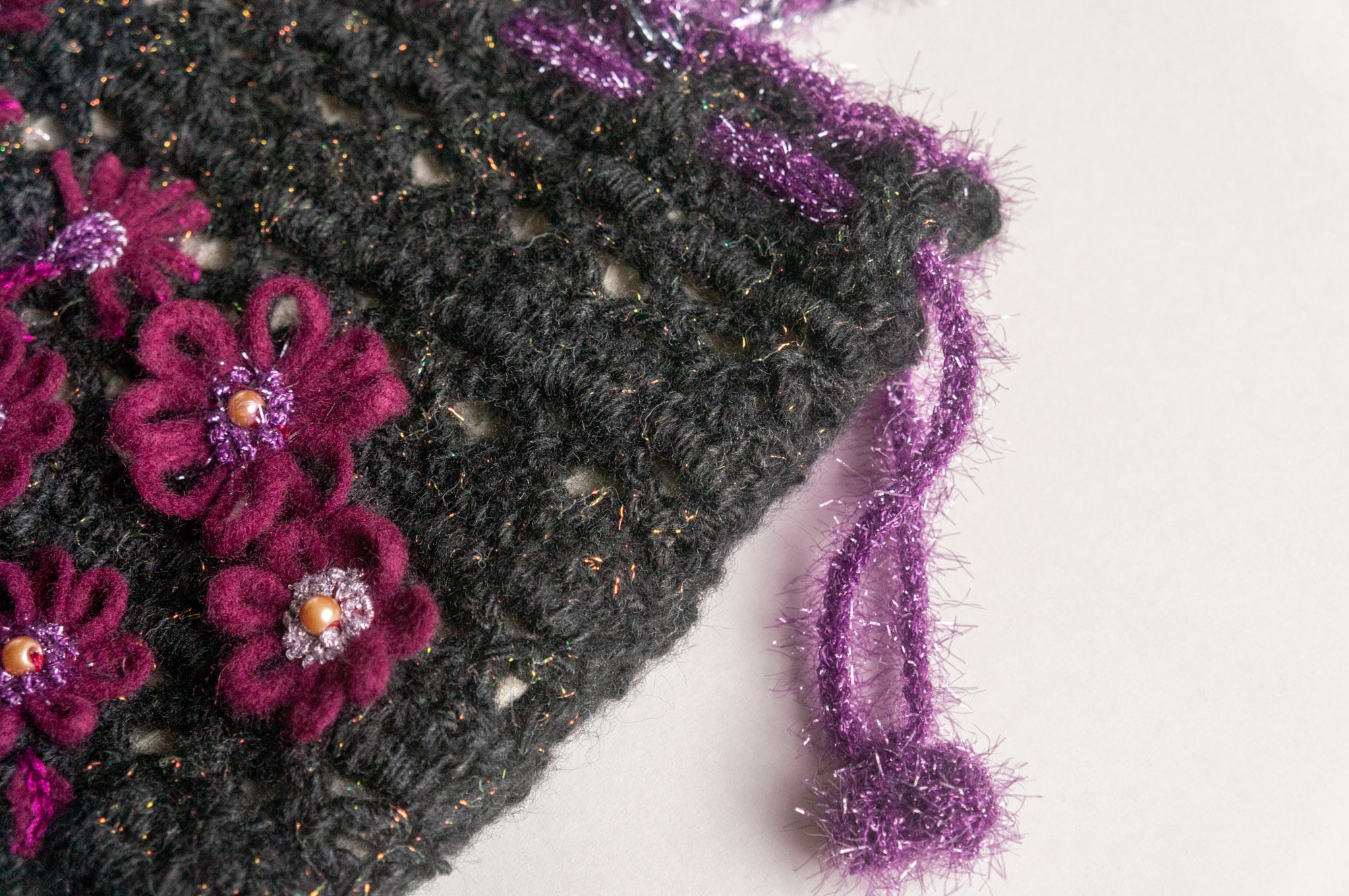【France - Pollyanna】手編みの巾着バッグ ブラック×ボルドーフラワー