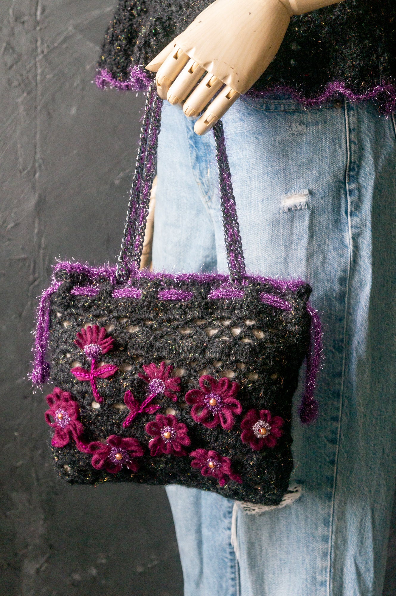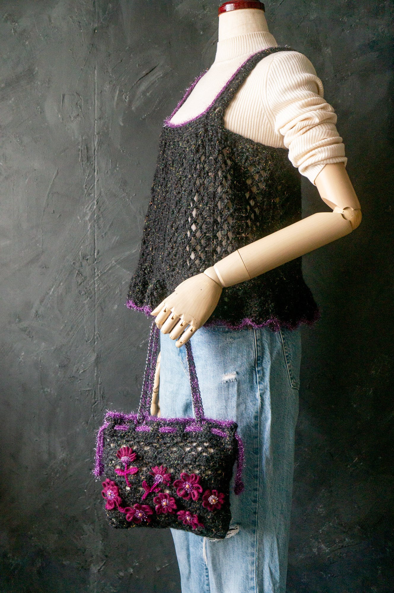 ブラックのラメ糸をベースに、パープルのラメ糸を縁取りと持ち手に使用した華やかなデザイン。