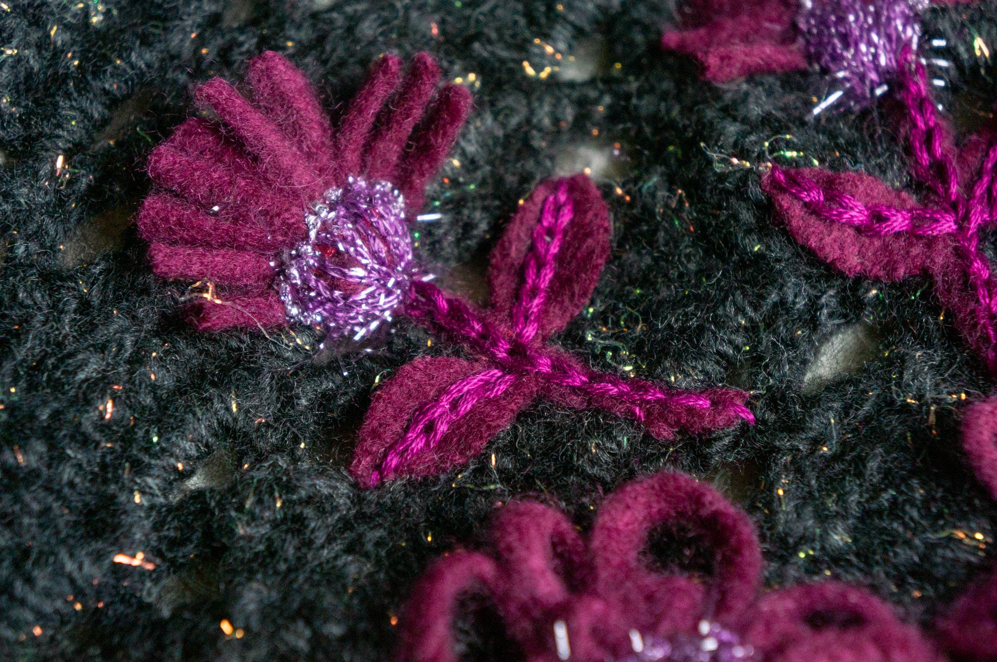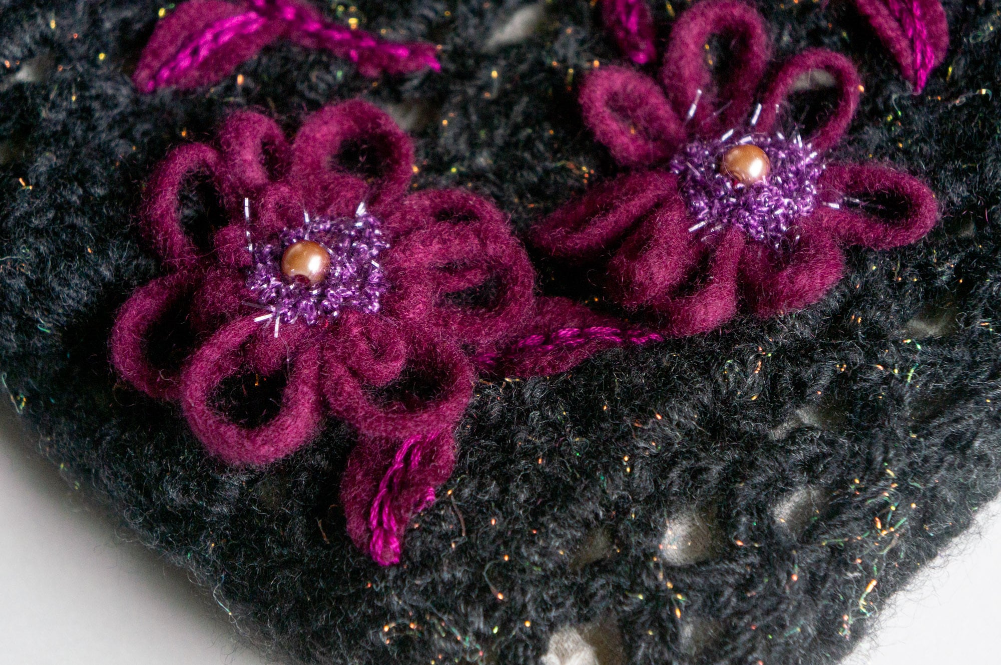 シックな黒に映えるボルドーの立体的な花のアップリケと、