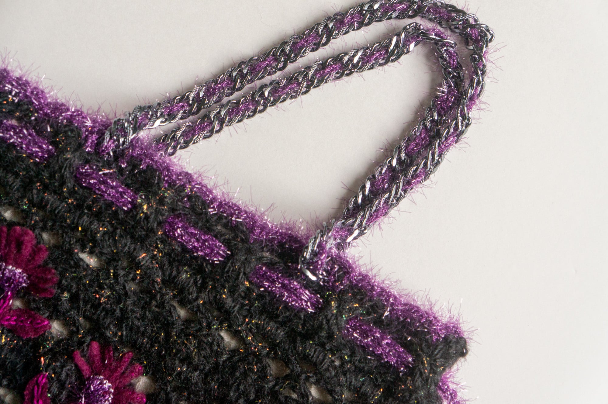 ハンドルにはパープルラメ糸を編み込んだチェーンを使用し、