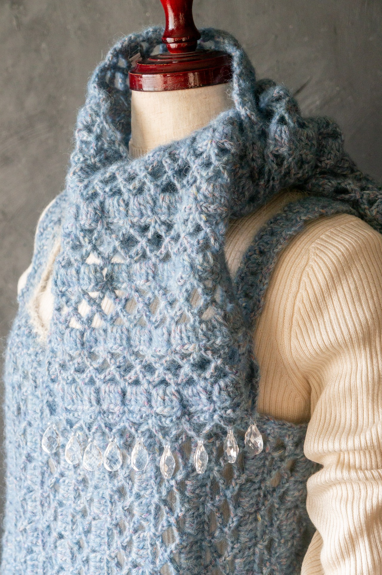 【France - Pollyanna】手編みのミニストール ブルーグレー×しずく型クリアビーズ
