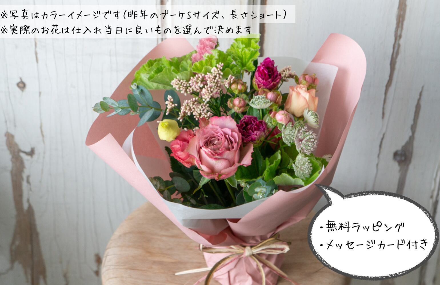 母の日のブーケは全て無料ラッピングとメッセージカード付き。