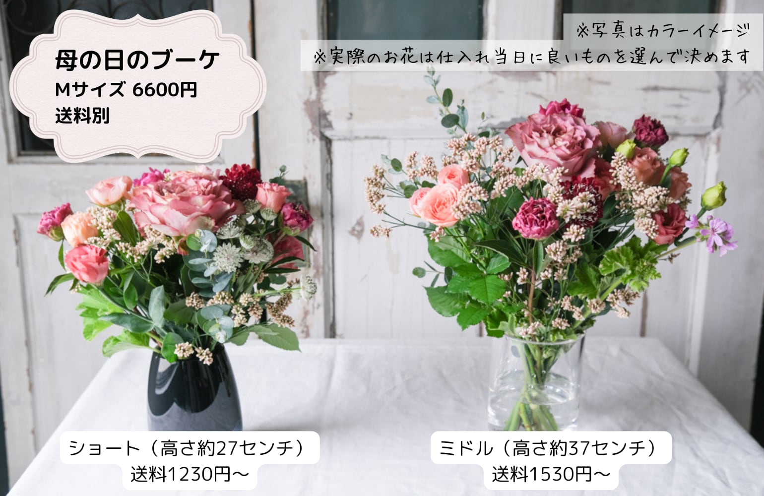 母の日の準備に伴い、5/9(土)は午後からのみとなりますが、事前にご連絡いただけたらアトリエでのお渡しも可能です。