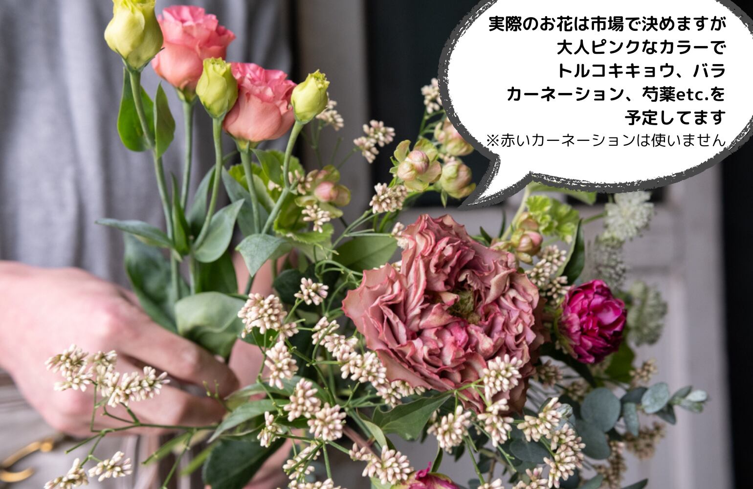 大人ピンクのカラーで、トルコキキョウ、バラ、カーネーション、芍薬etc.を予定しています。