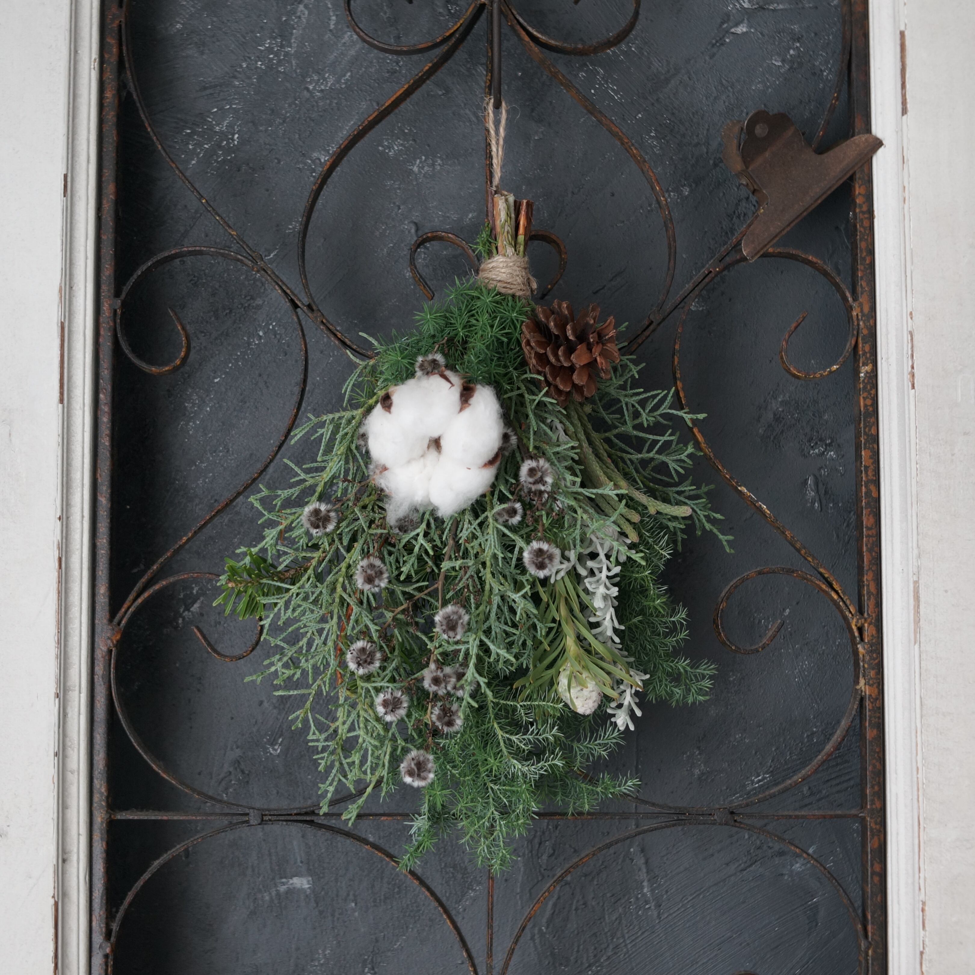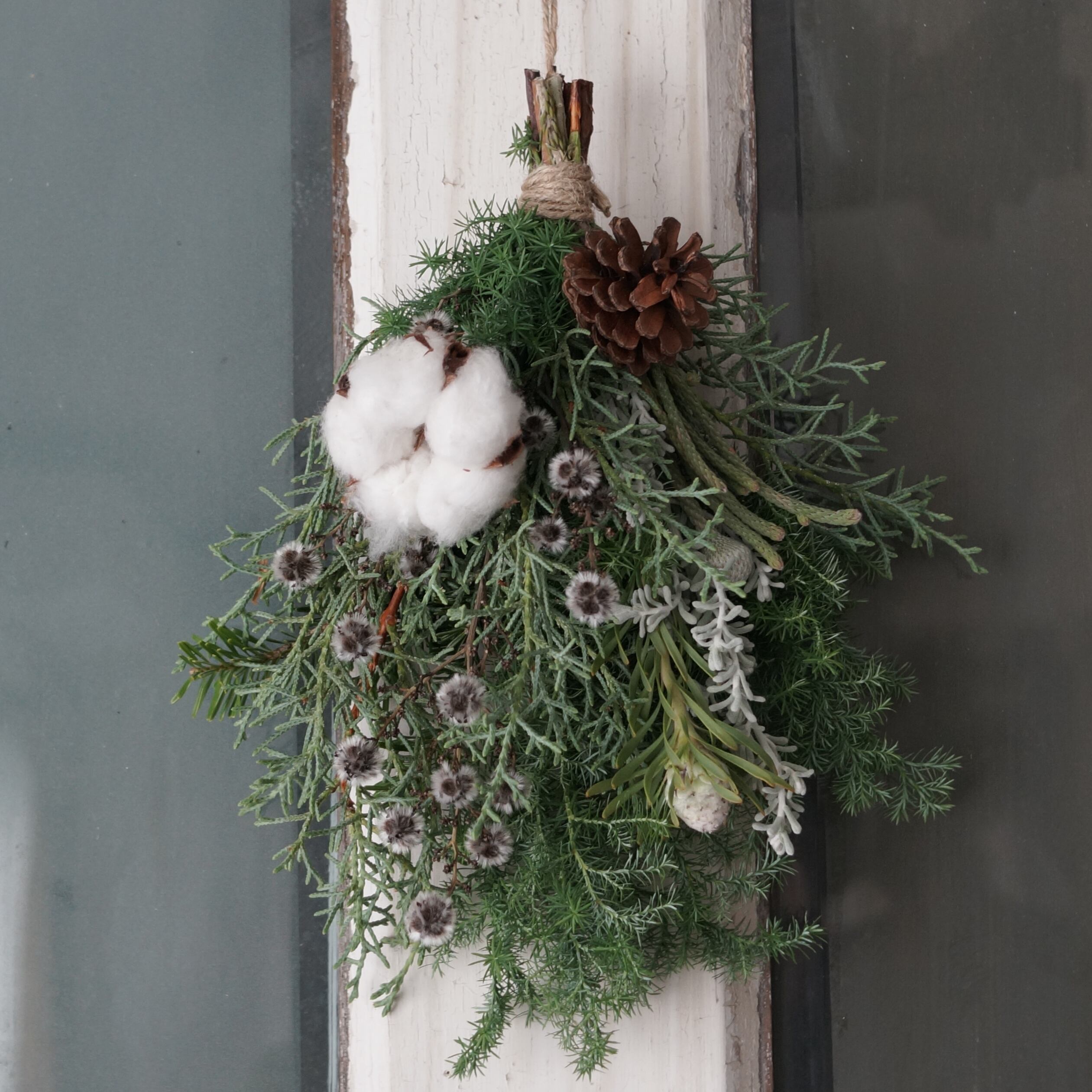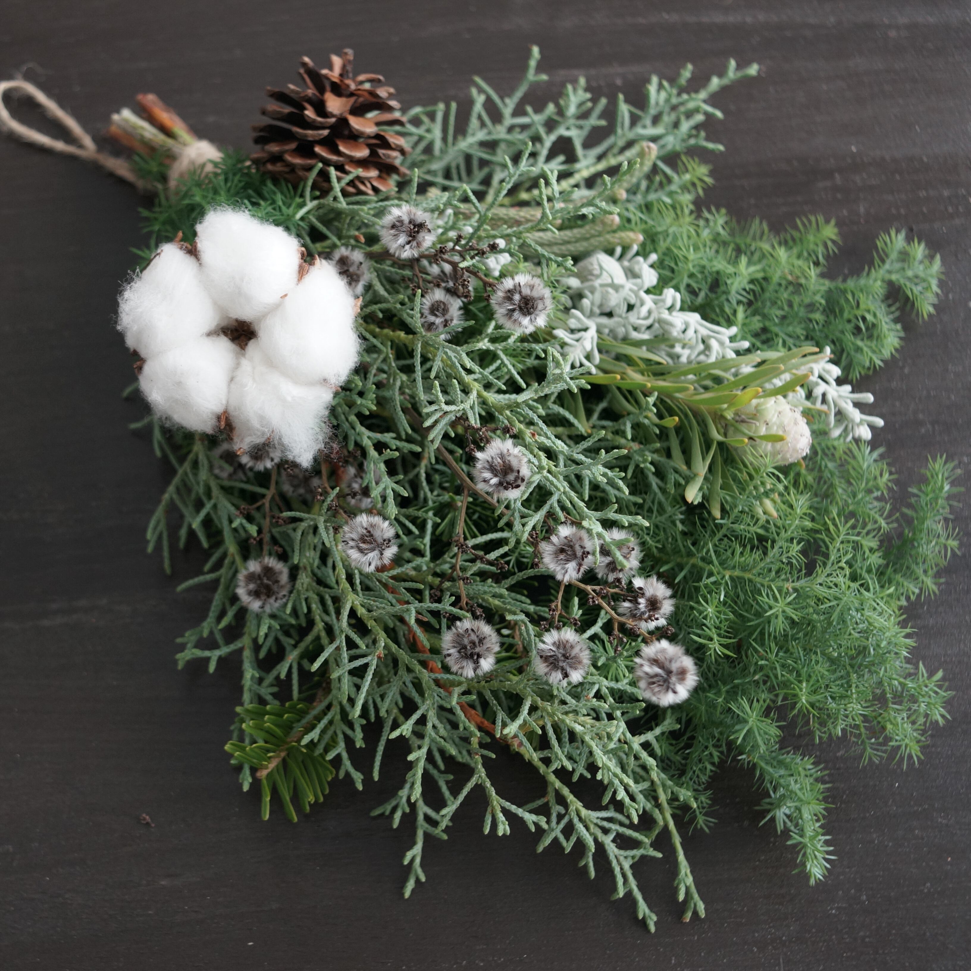 冬らしい雰囲気のコットンや松かさ、南アフリカやオーストラリアのワイルドフラワーなどを組み合わせてお作りしました。