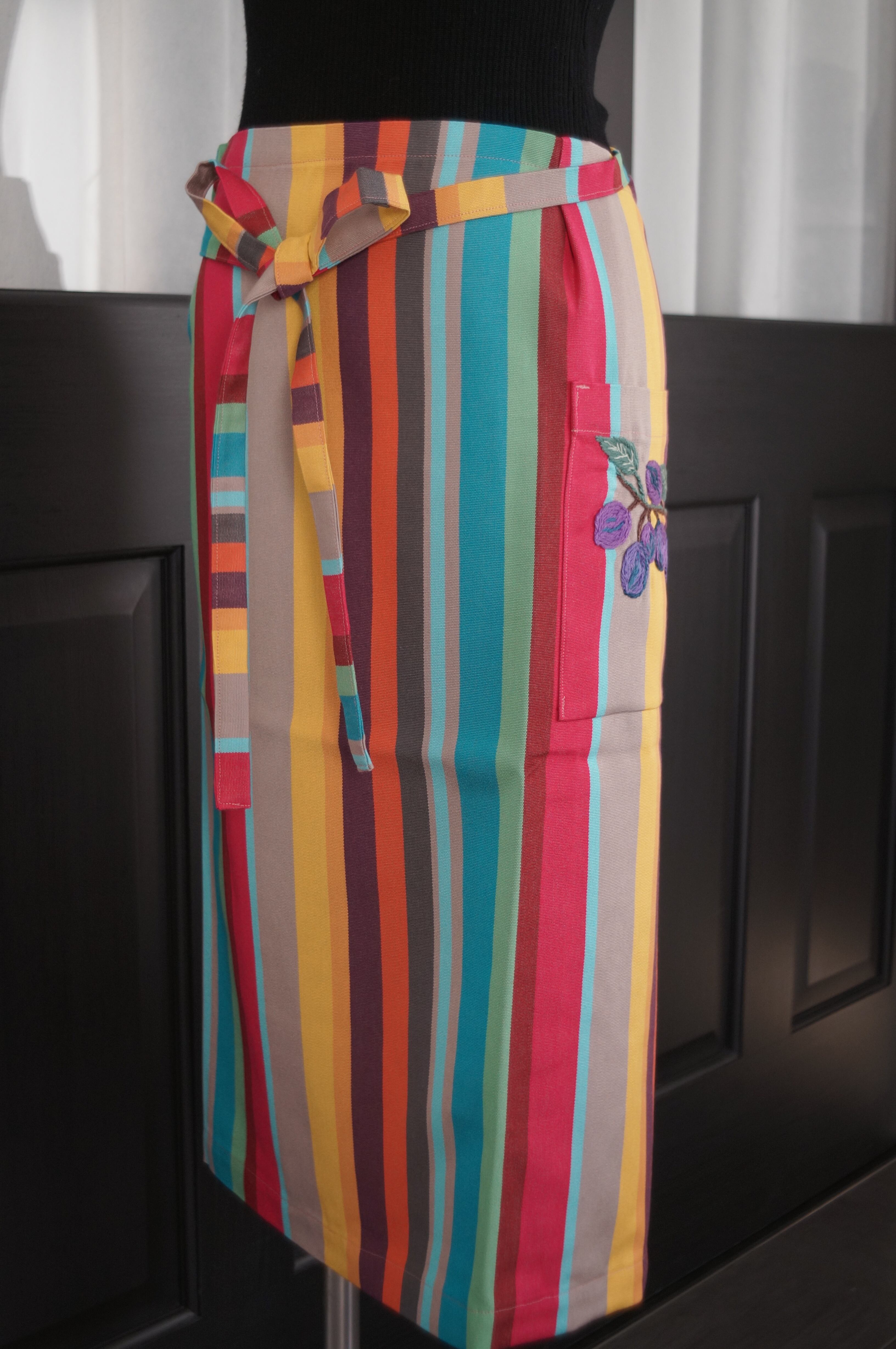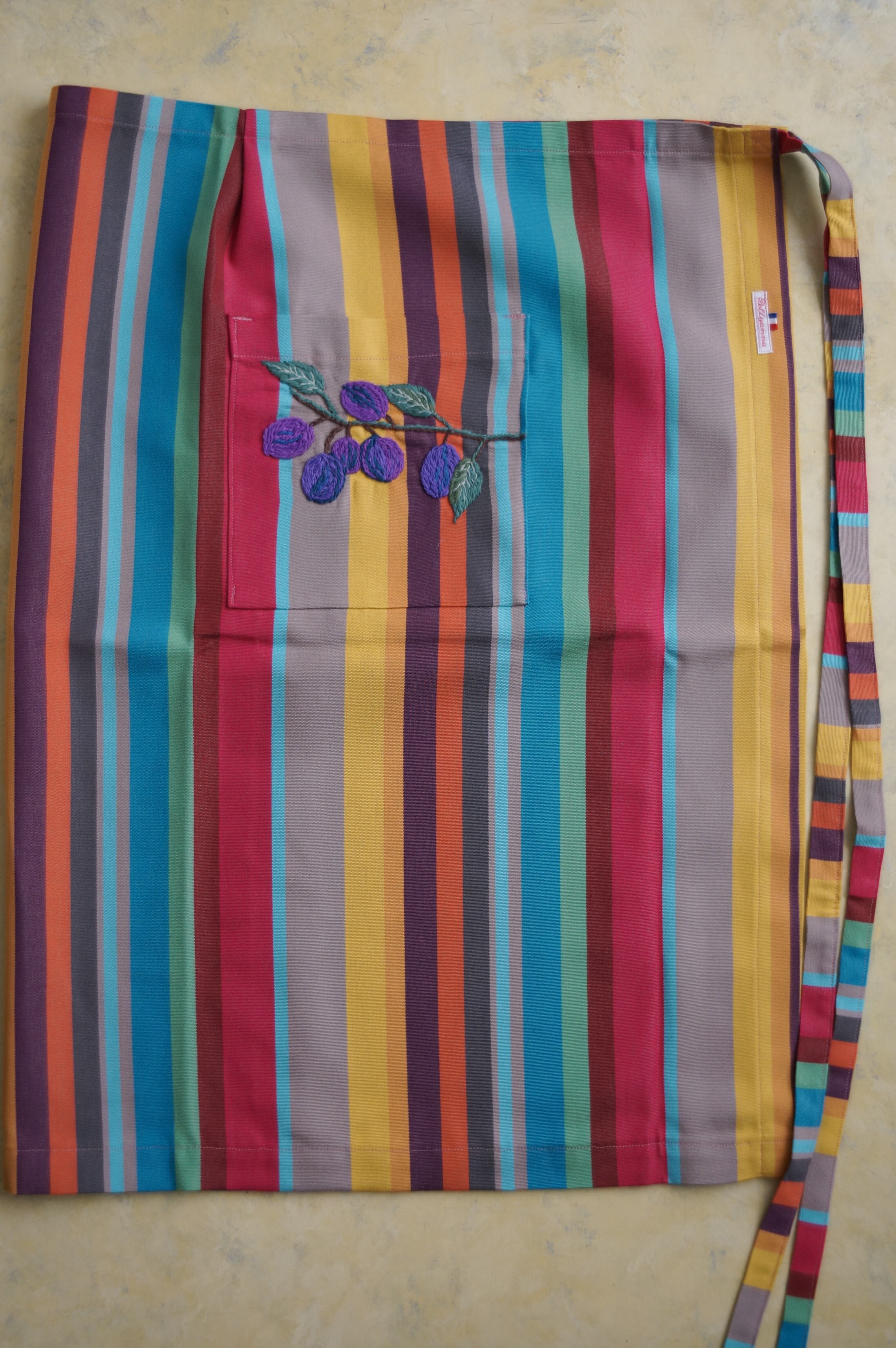 南仏プロバンスのような色彩のマルチストライプに、プルーンの手刺繍が素敵です。