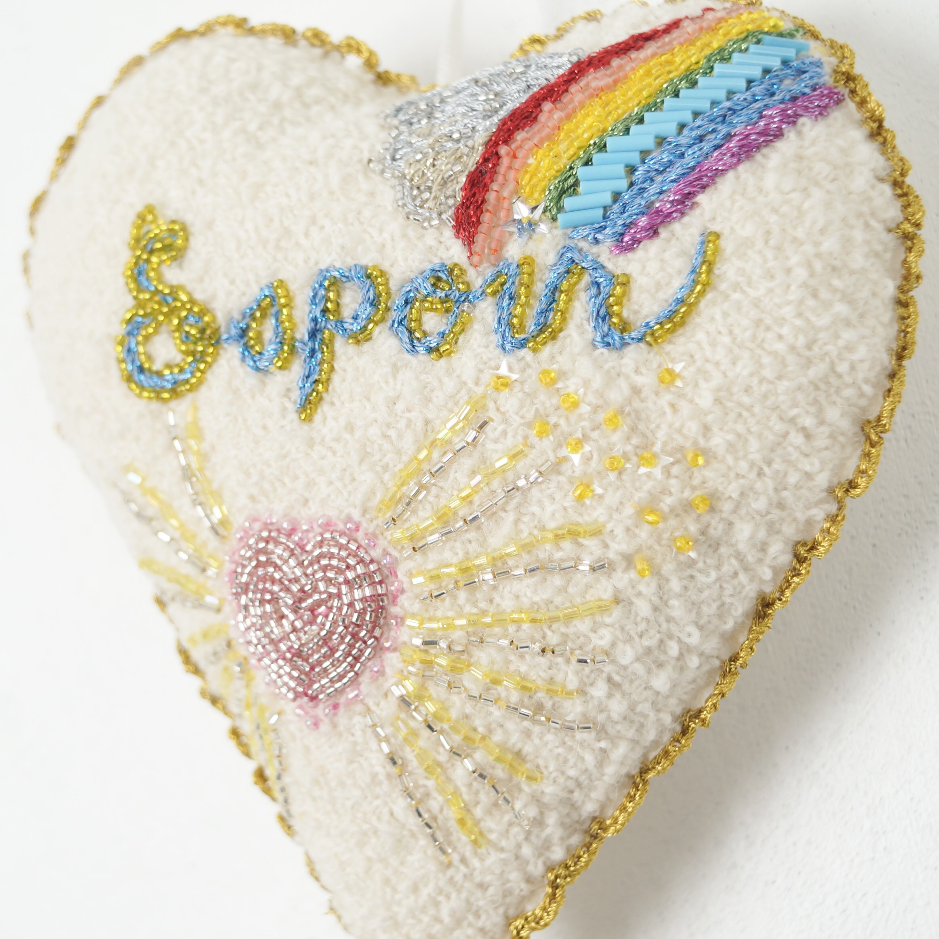 生成りの生地に明るいレインボーの刺繍がまさに希望="espoir"という雰囲気のサシェ。