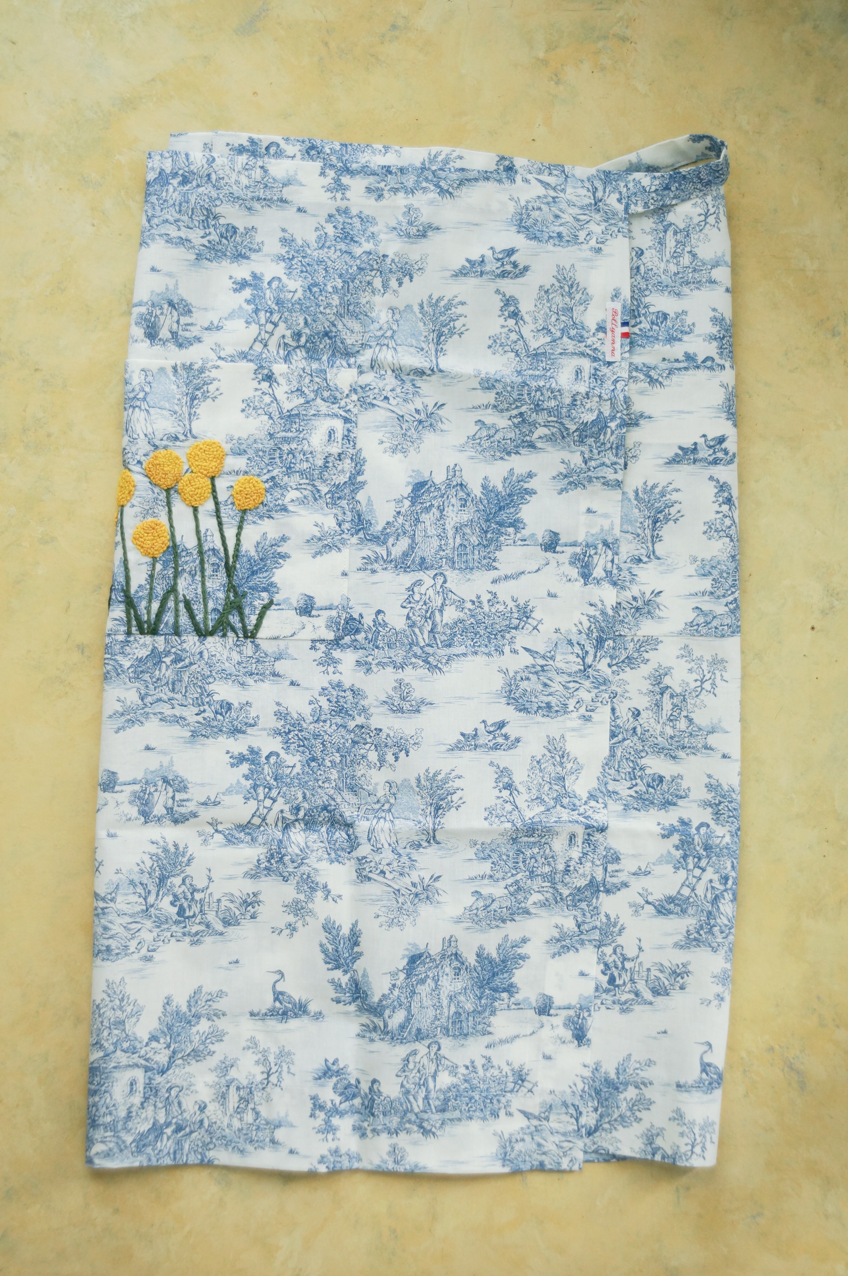 生成地にブルーのプリントが上品なトワル・ド・ジュイの生地に黄色のお花刺繍が爽やか。