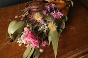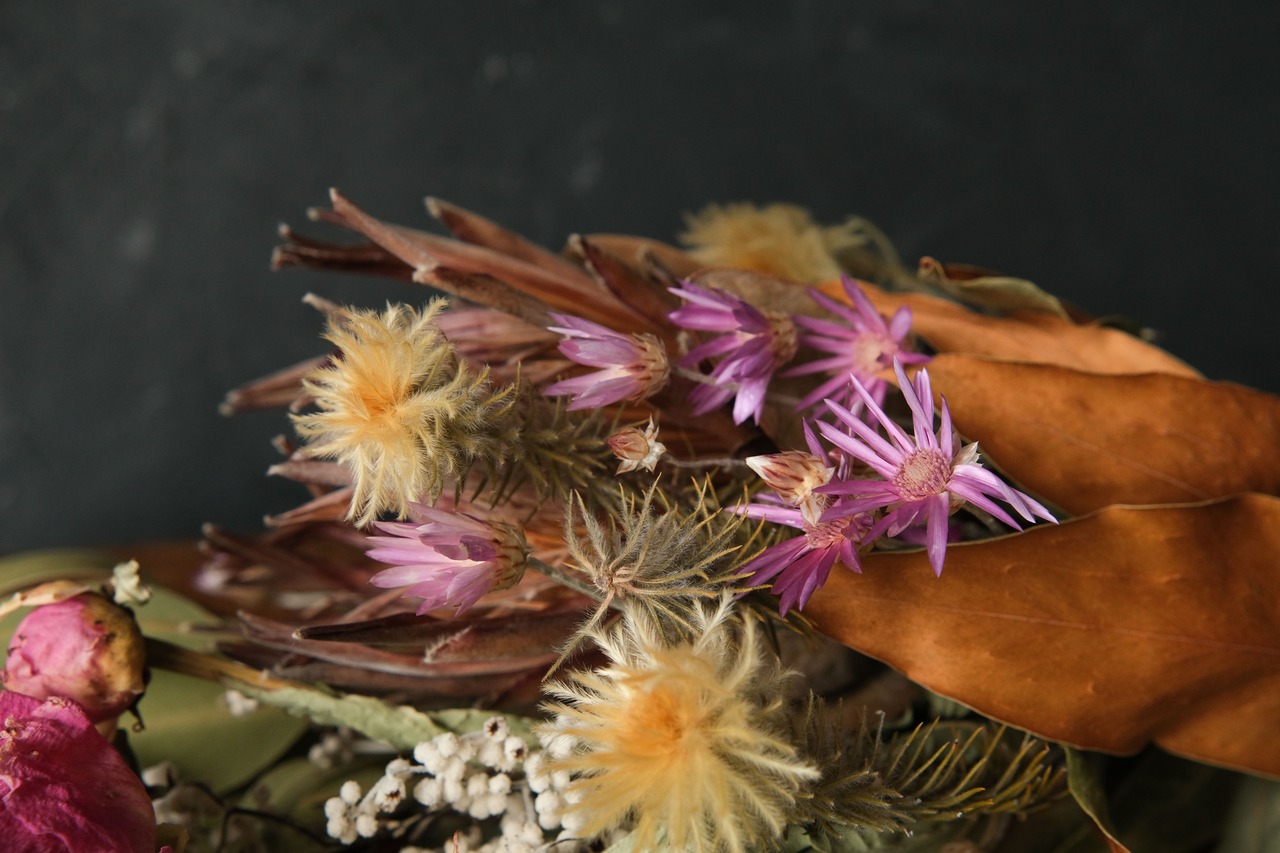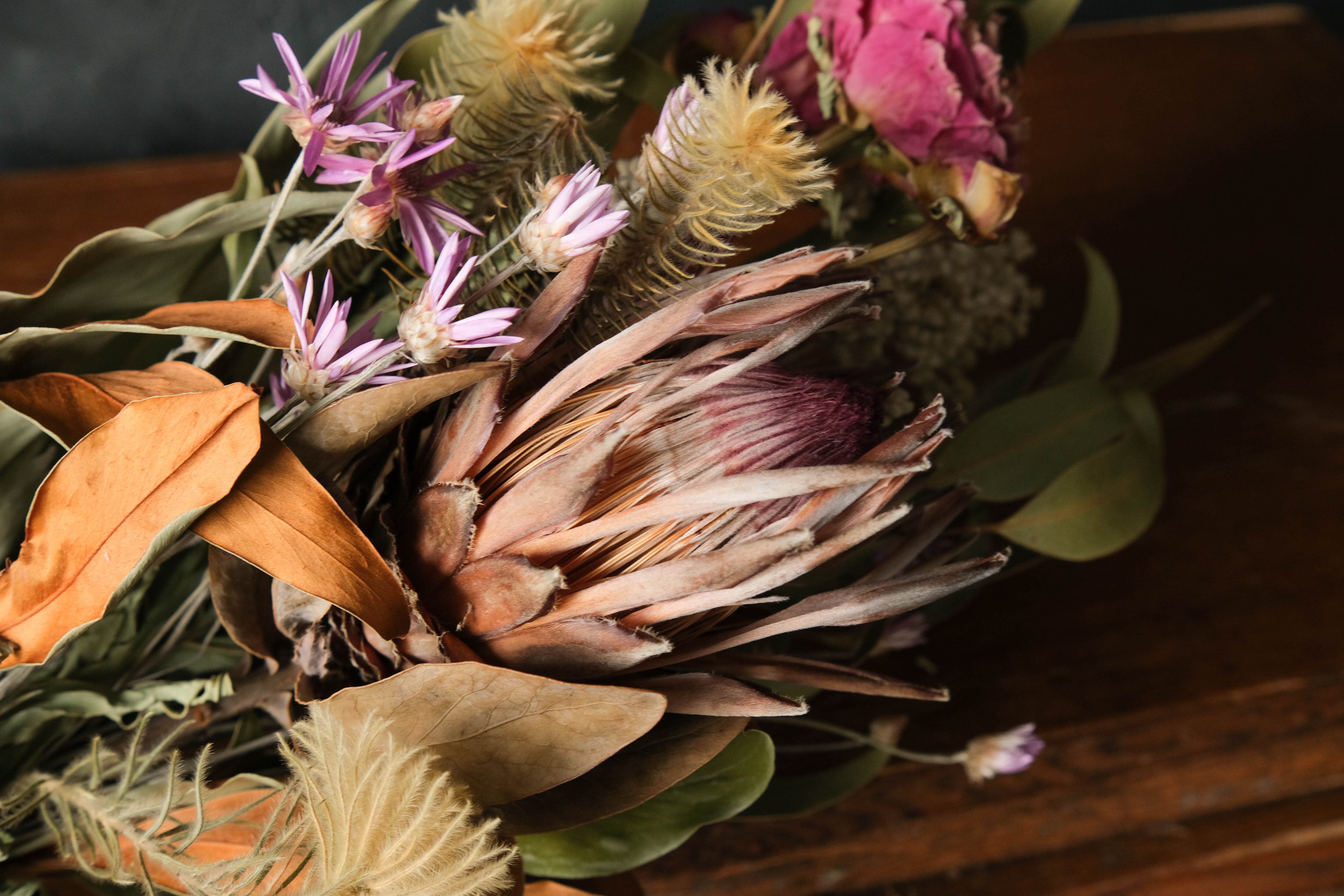 鮮やかなピンクの芍薬と、存在感のあるクイーンプロテア シャロンのドライフラワーをメインに、色合いが楽しく、姿かたちが個性的なワイルドフラワーなどを束ねてドライブーケ&スワッグに仕立てました。