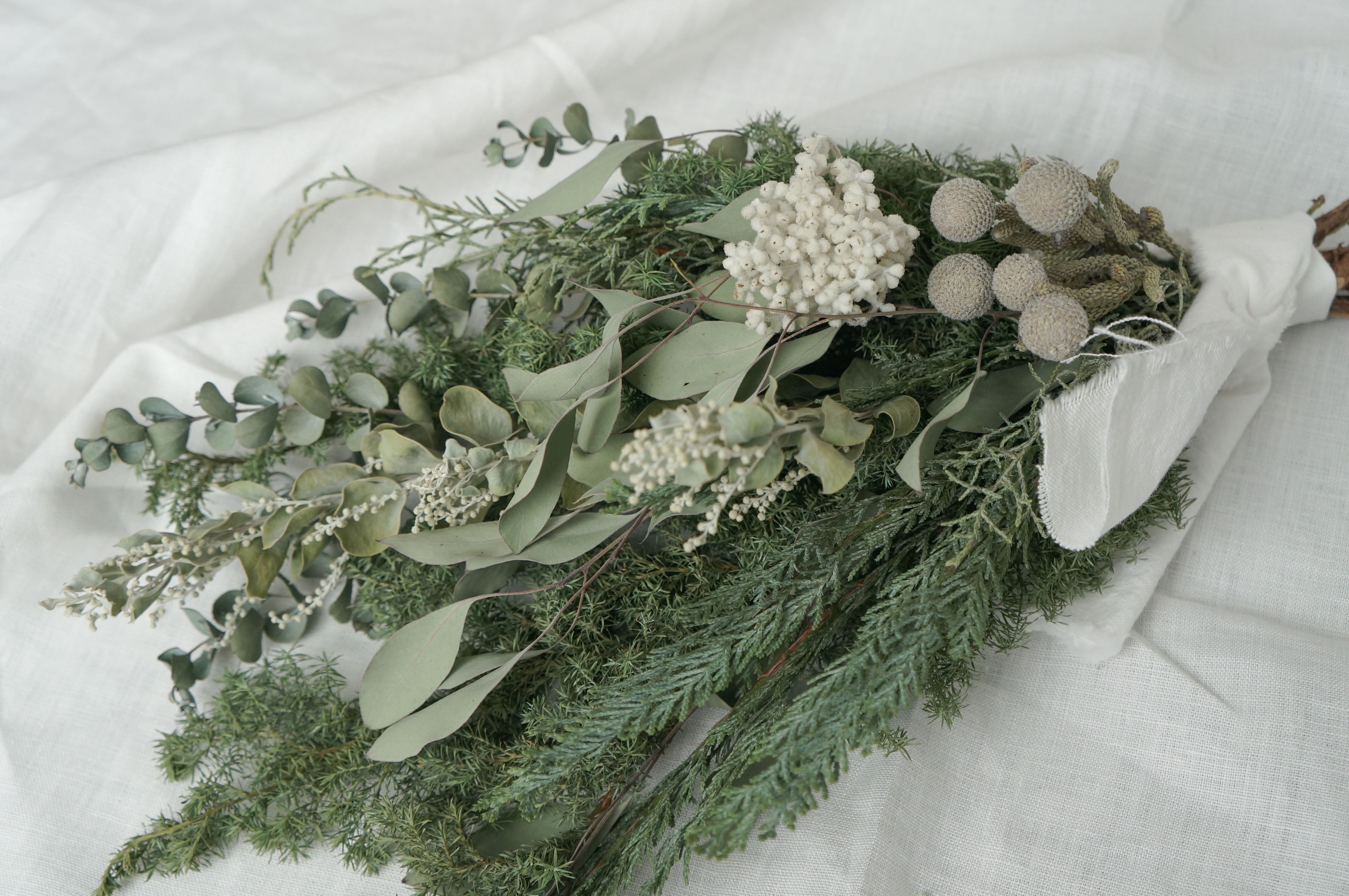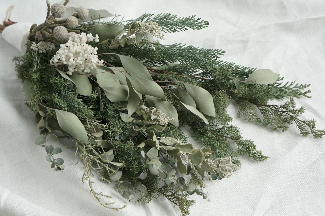 針葉樹をメインに、飾りやすい小さめのスワッグを作りました。