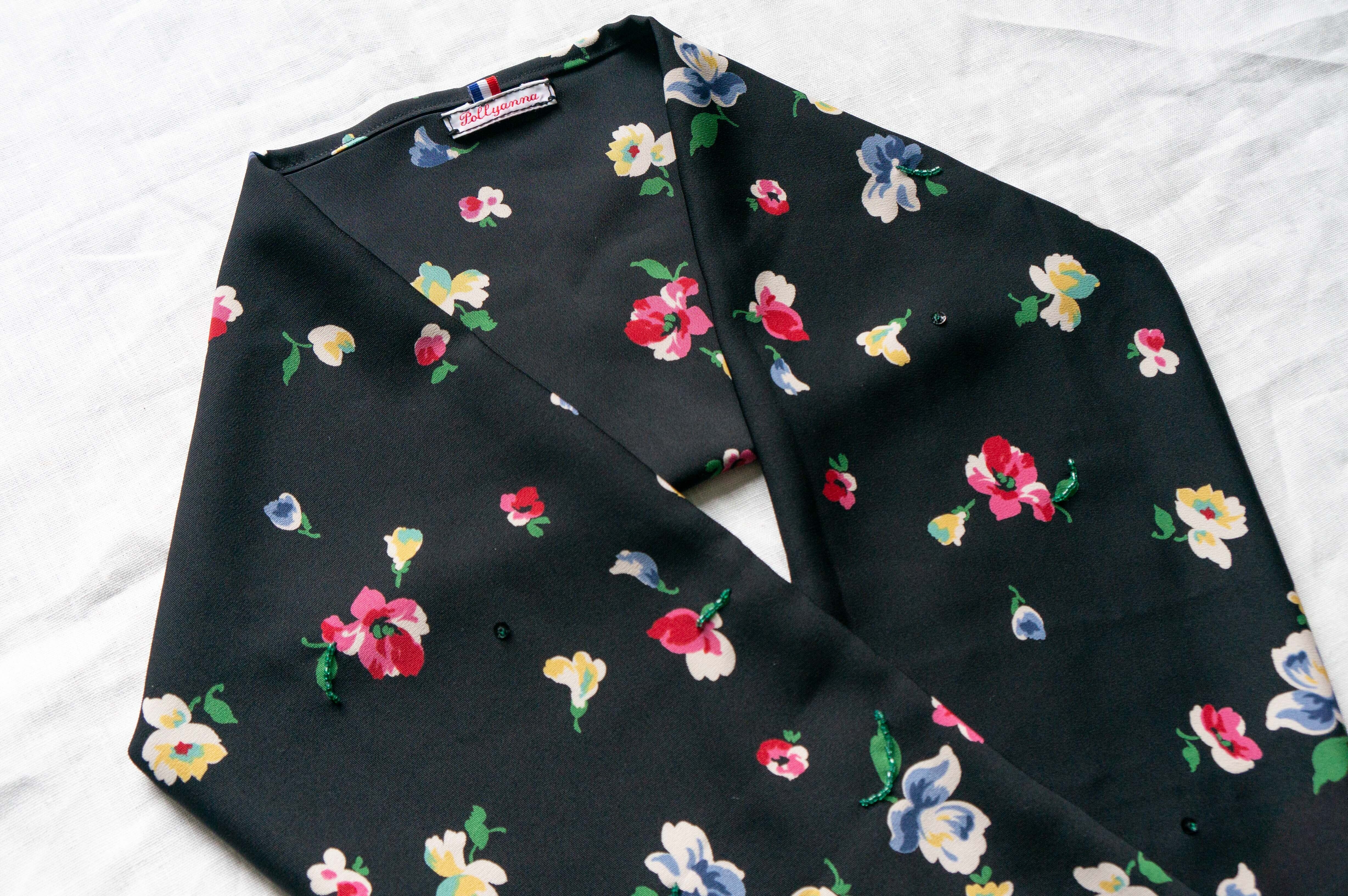 柔らかく、シワになりにくい小花柄プリントの生地に、柄に合わせたビーズ刺しゅうがキラリと輝き可愛らしい。