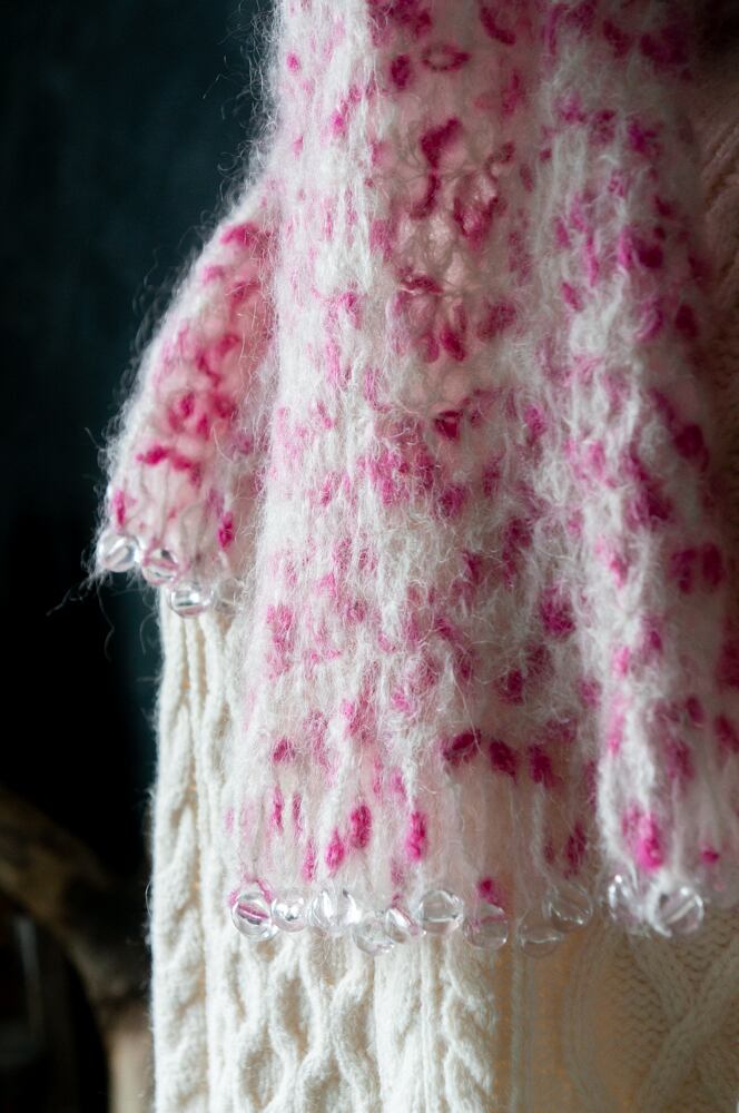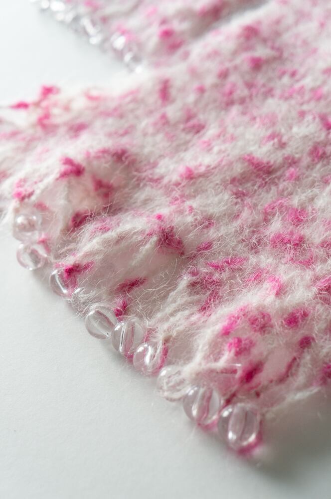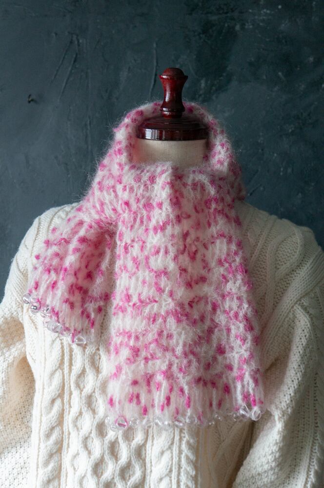 マフラーの端にはつるんとした透明ビーズがあしらわれており、
