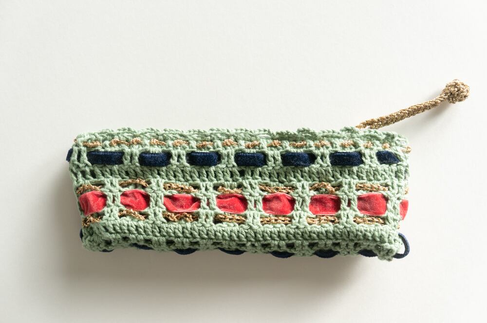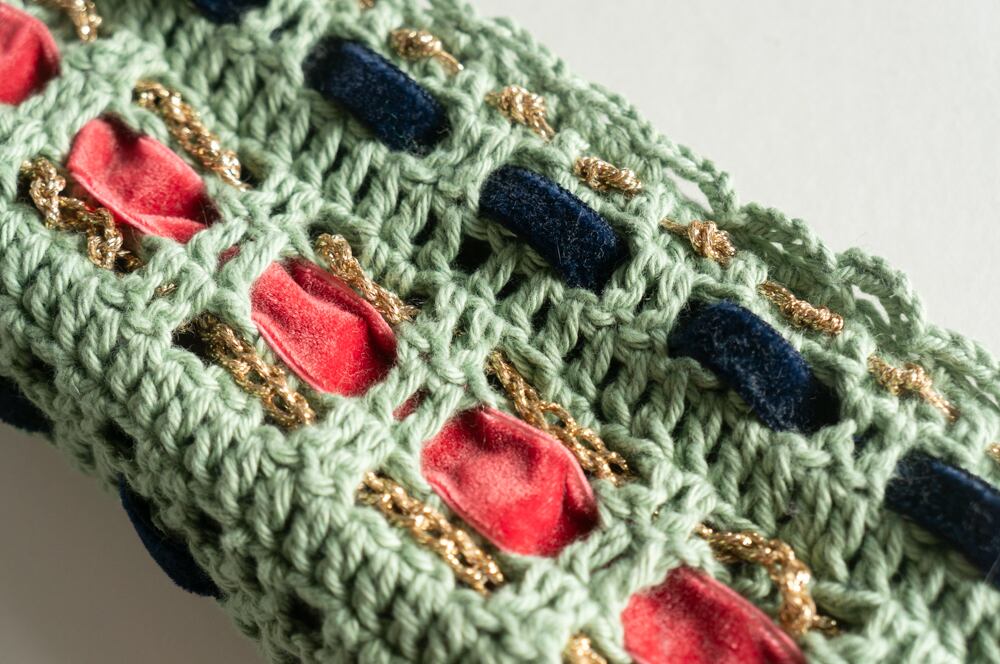 ややペールグリーンにライトグレーを混ぜたような色の糸をベースに編まれた、