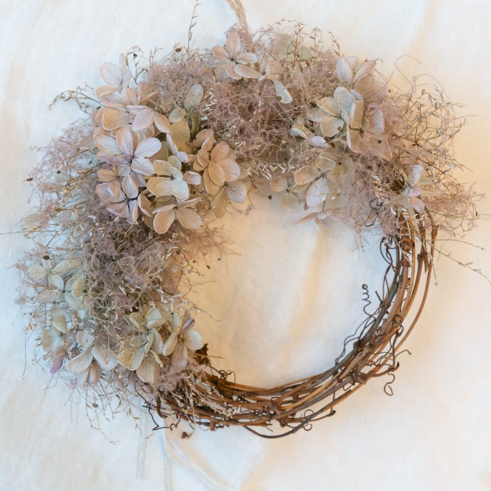 アンティークが好きなあなたへ届けたい、プリザーブドフラワーのあじさいとドライのスモークツリーをメインに使ったハーフリースです。