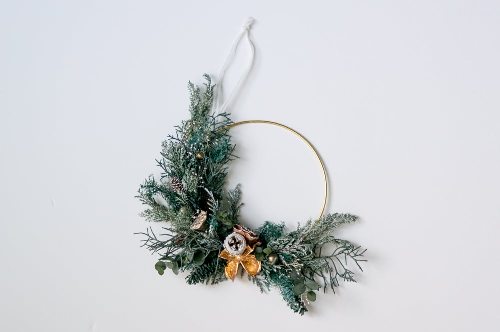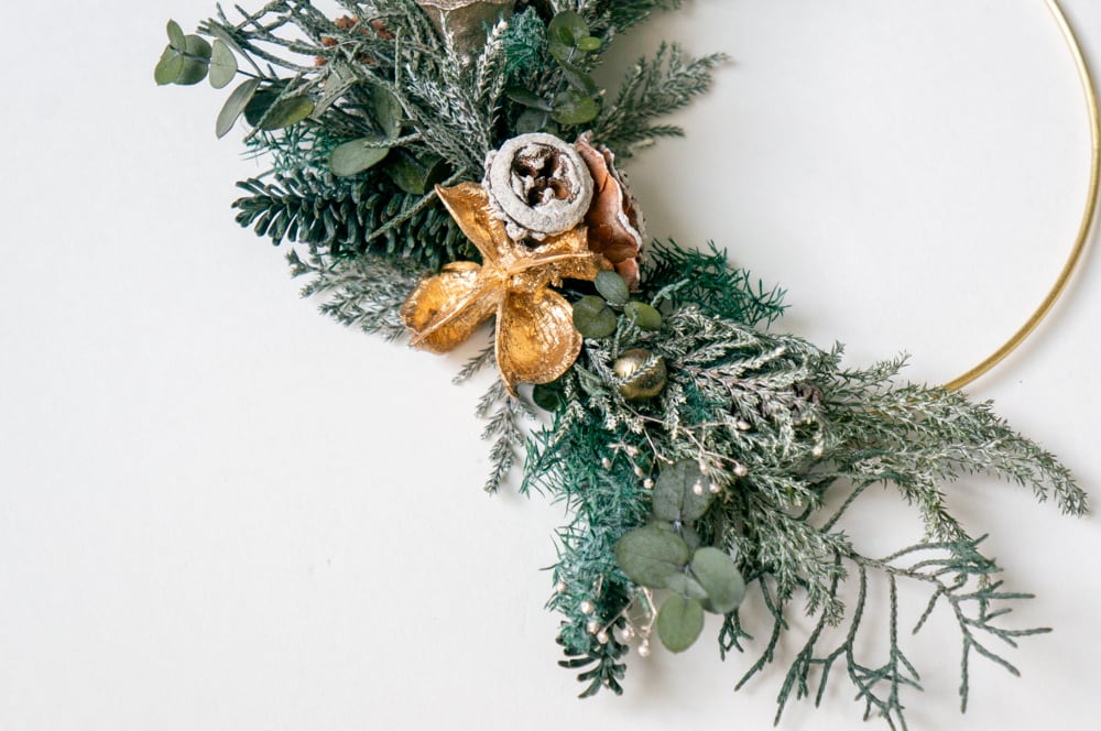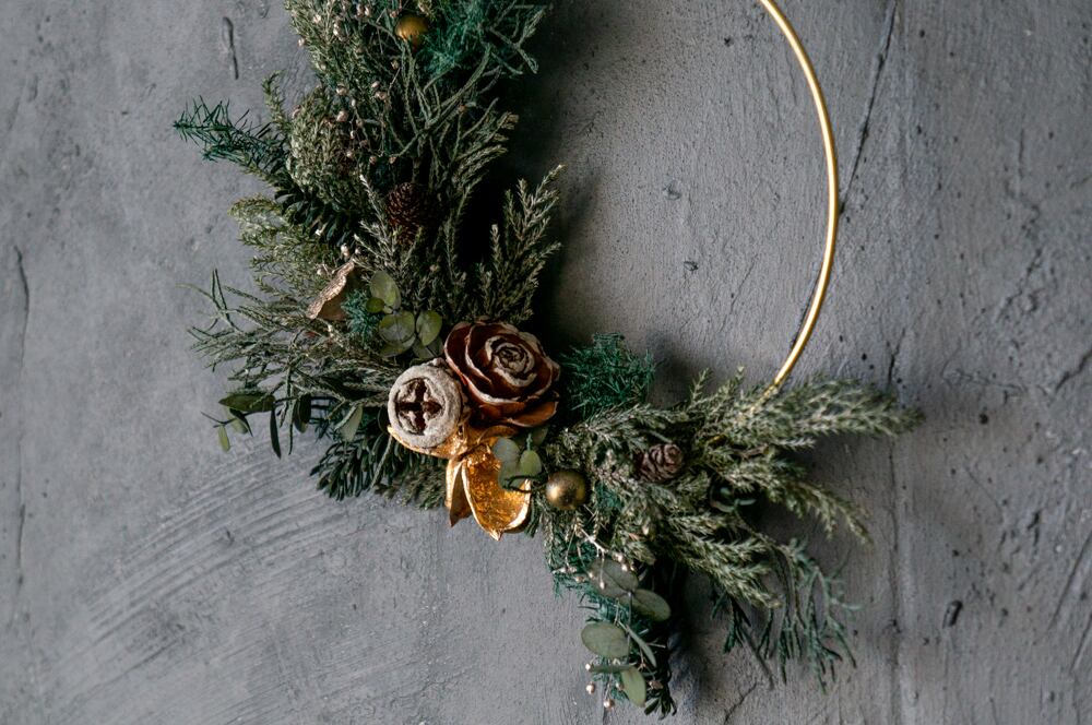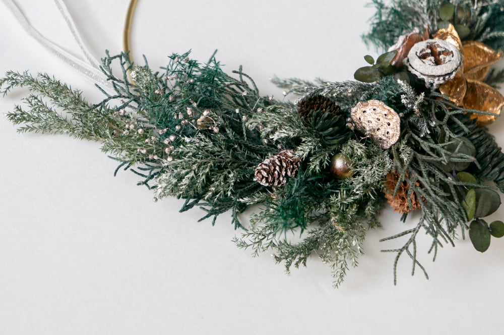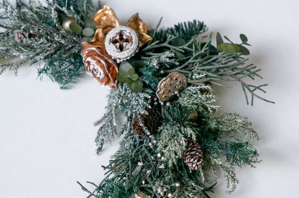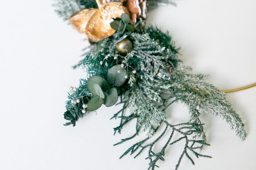 シンプルなゴールドフレームをベースに、針葉樹などのプリザーブドフラワーを使った冬のリースです。