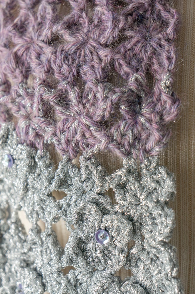 ペルー産アルパカ100%のラベンダー色の糸と、シルバーラメの輝きがさりげなくアクセントになっています。