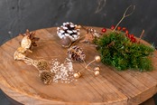 松かさや野バラの赤い実、プリザーブド加工の針葉樹を贅沢にあしらった、わくわく感あふれるクリスマスガーランドです。さまざまな実が織りなす自然の風合いが、ホリデーシーズンを華やかに彩ります。