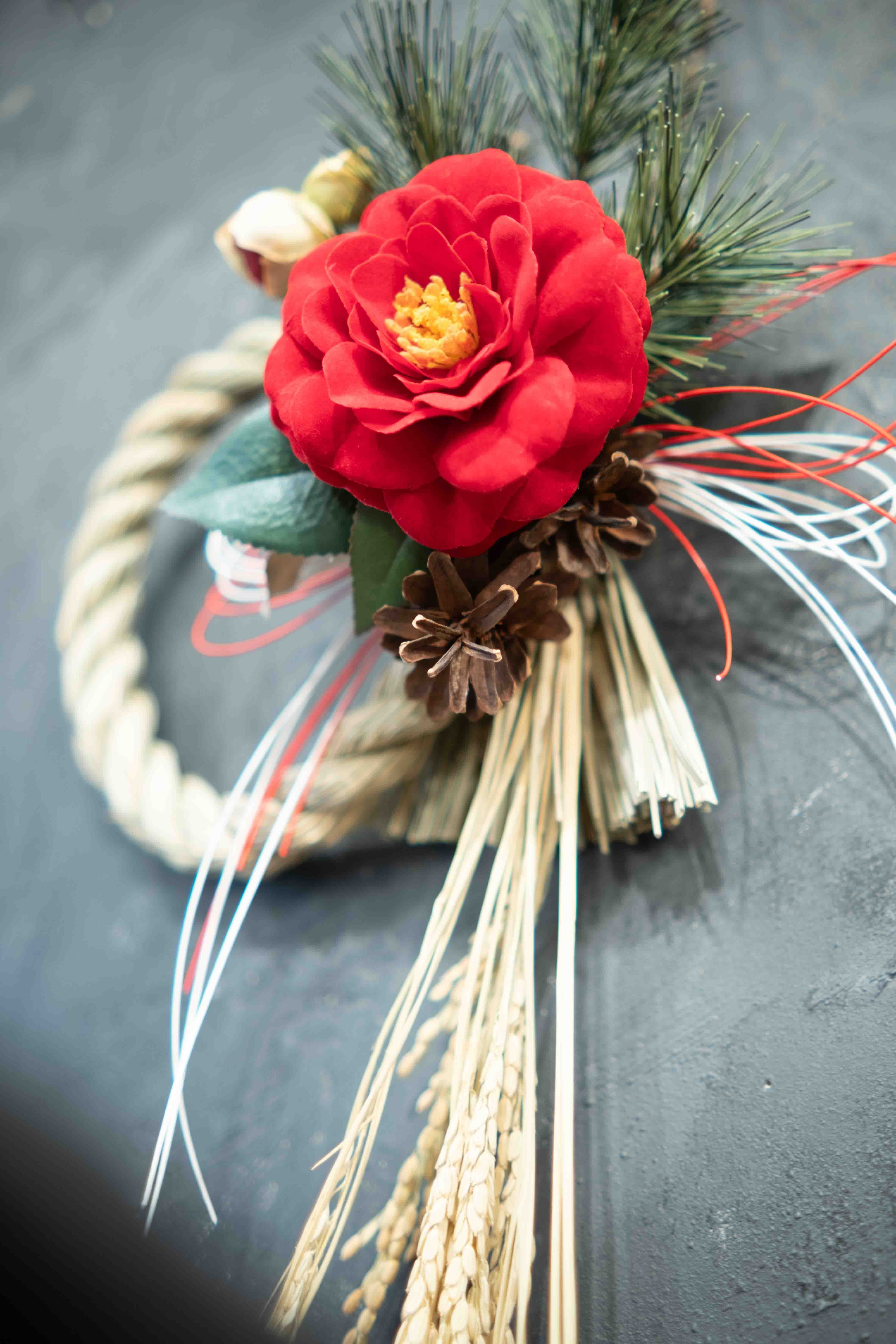 伝統的な藁のしめ縄に、鮮やかな赤い椿と緑の松を合わせ、