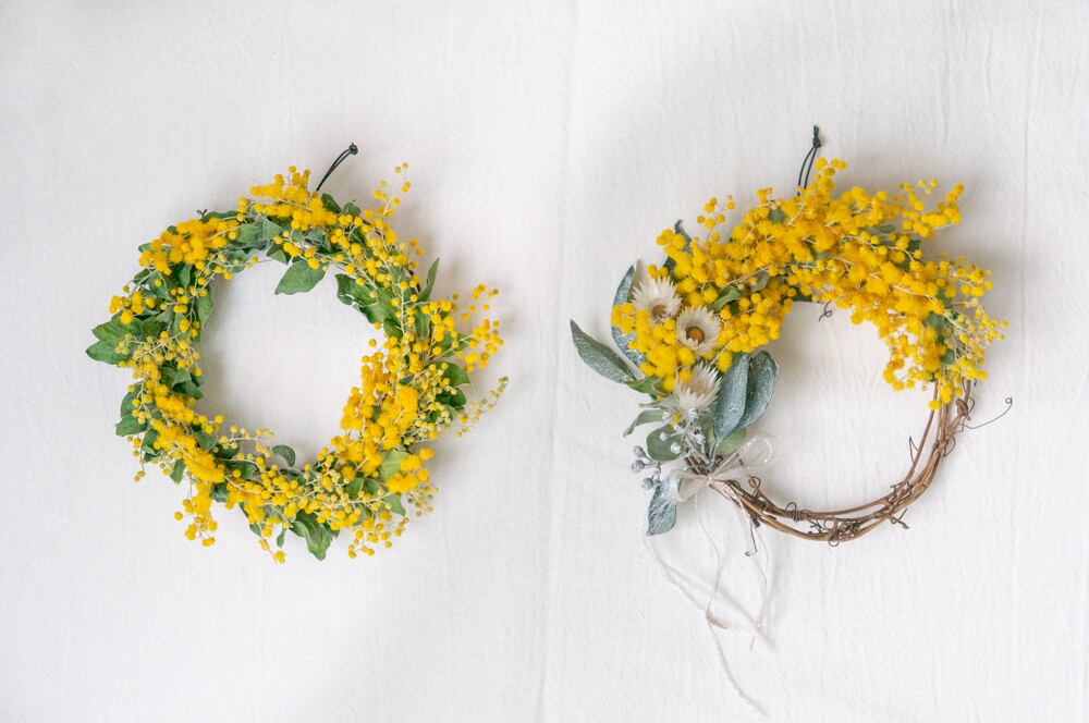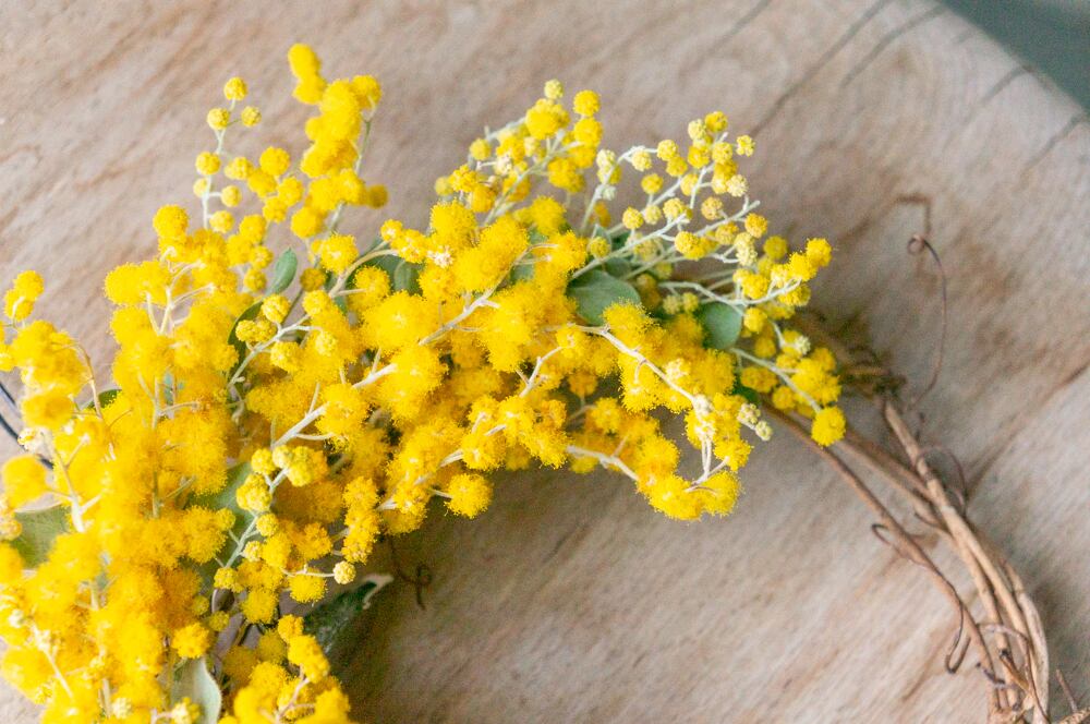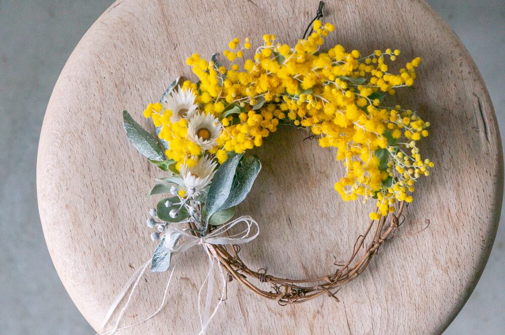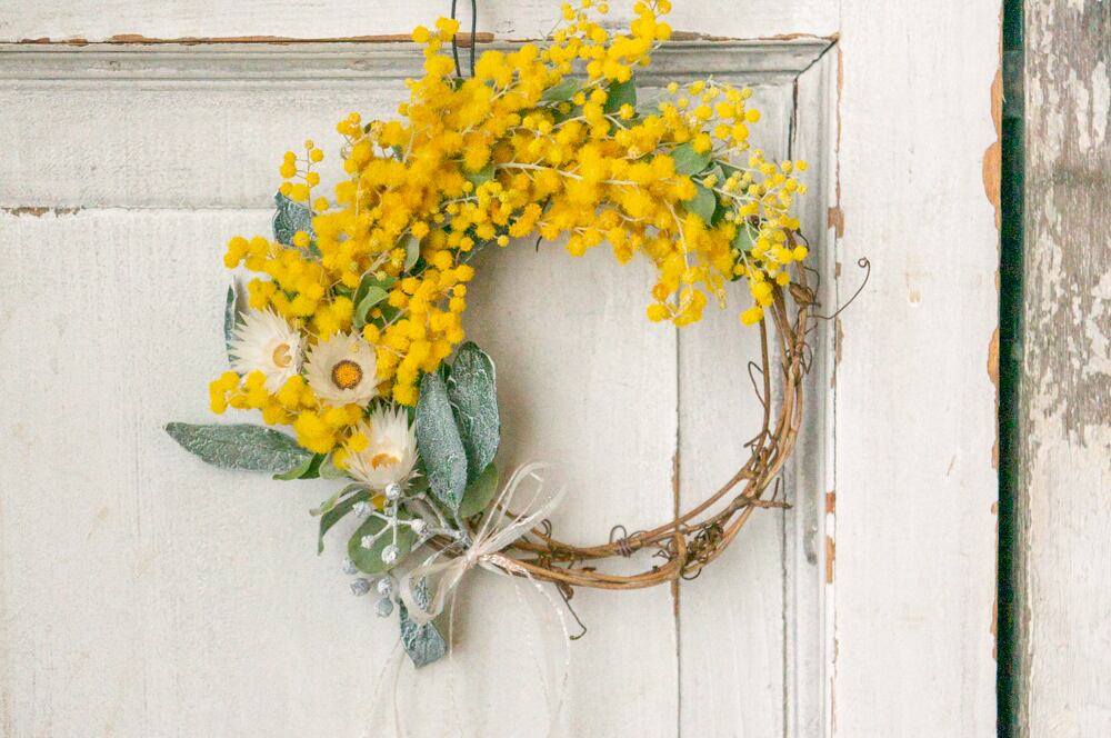 春を呼び込む、ミモザのリース。